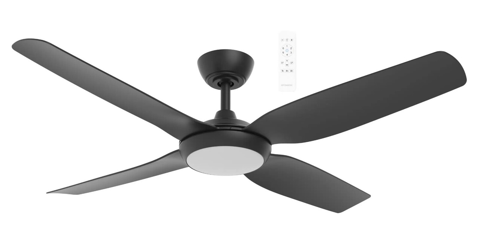 The Martec Viper DC 4 MVDC1343M 52 Inch Matt Black Smart DC Ceiling Fan with LED Light is a sleek high-performance ceiling fan designed for modern Australian interiors and covered outdoor entertaining spaces. With its matt black finish, slimline 4 blade ABS construction, integrated LED light and smart WiFi functionality, this fan delivers strong airflow with quiet efficient operation and convenient everyday control. The 36W brushless DC motor works with the Smart Life app and included WiFi remote, giving access to 6 speeds, breeze mode, sleep mode, timer settings and summer winter reverse mode. The 18W LED light offers variable dimming and adjustable colour temperature from 2700K to 6000K for tailored lighting. Available through Alstra Lighting, this Martec ceiling fan is ideal for customers searching for a black smart ceiling fan with light, 52 inch DC fan with WiFi remote or modern covered outdoor ceiling fan with LED light.