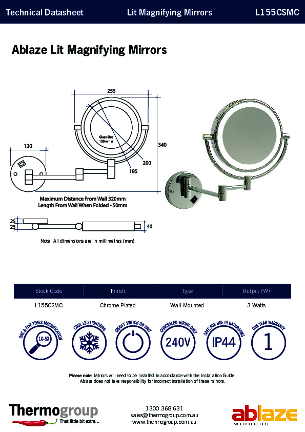 The L155CSMC magnifying mirror adds style and a sense of beauty to your room. This mirror features a double sided mirror with 5x magnification and normal mirror (no magnification). This mirror can be flipped 360° and can be folded back out of the way when not in use.