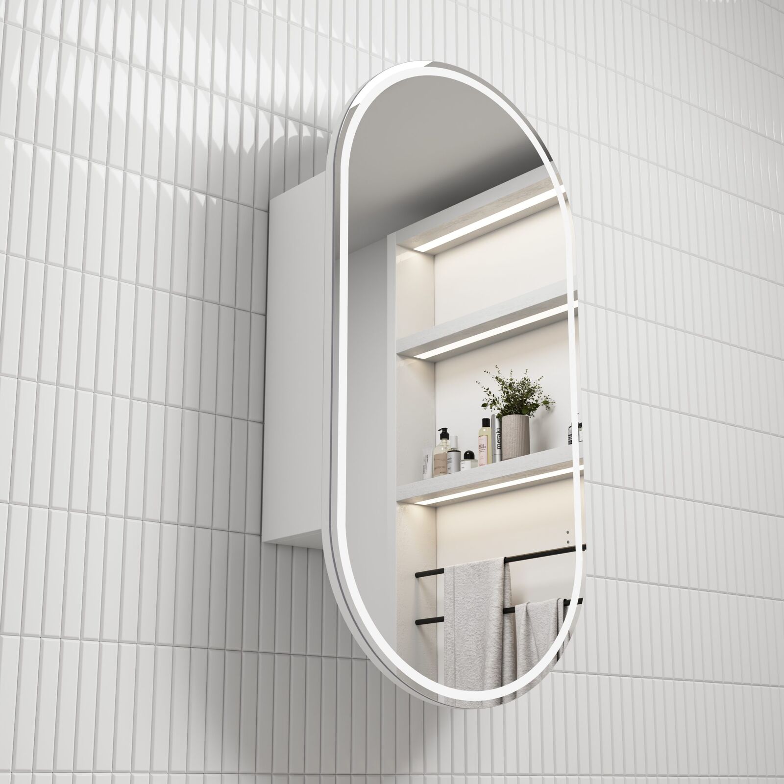 - Frameless oval LED shaving cabinet