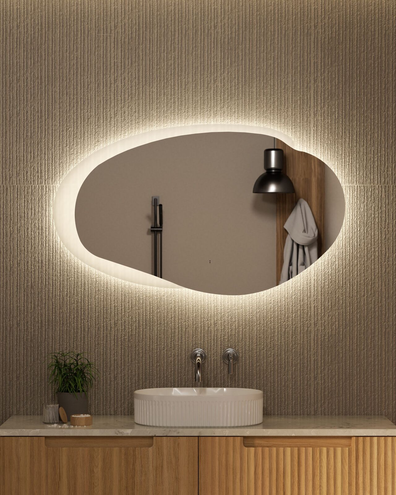 The Aulic Evanston 1100mm LED Mirror with matte grey acrylic edge delivers modern architectural styling and advanced lighting functionality for contemporary bathrooms. The distinctive organic oval design creates a striking feature while providing practical backlit illumination ideal for everyday grooming and makeup application.