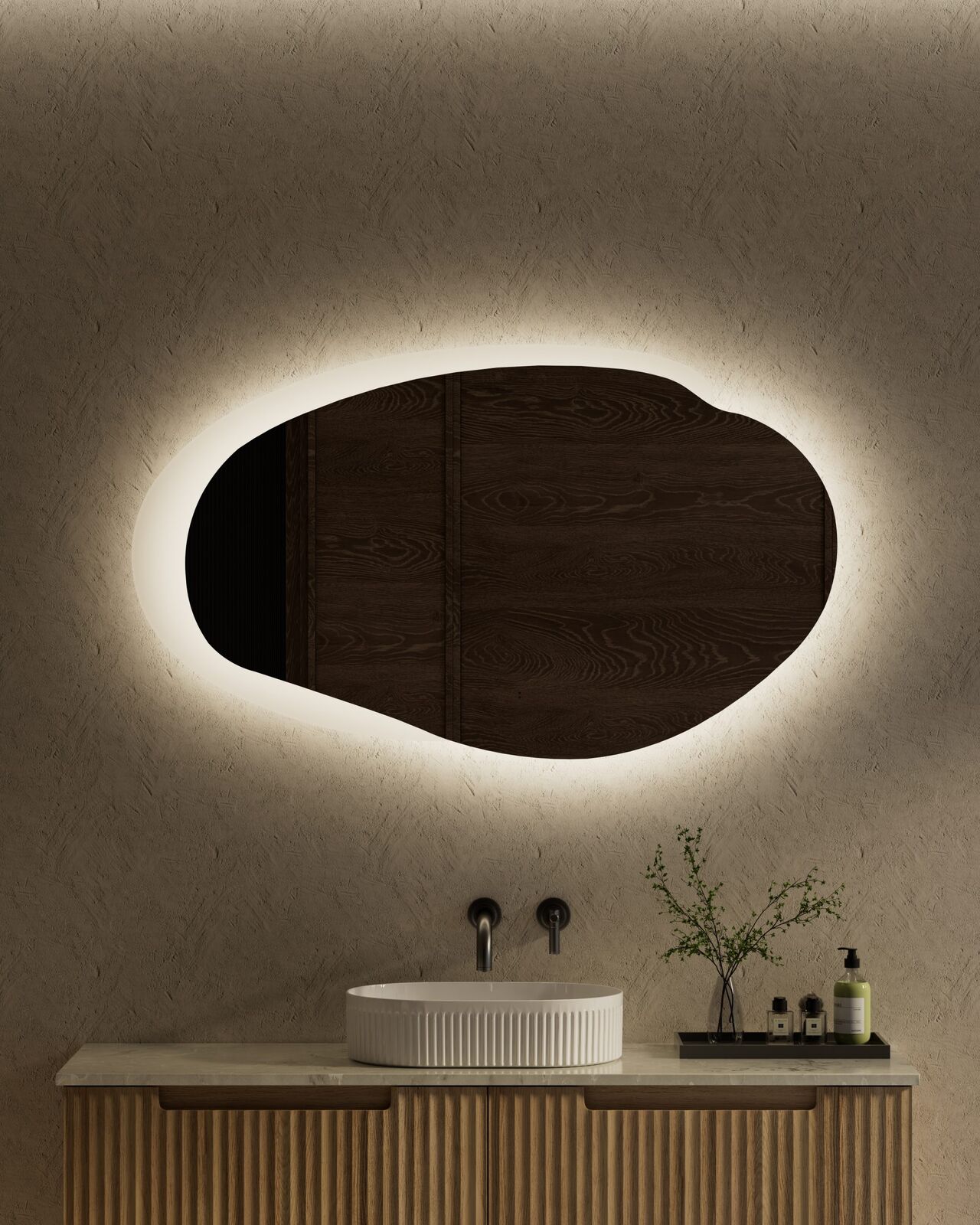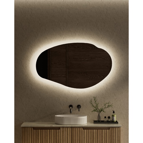 The Aulic Evanston 1300mm LED Mirror in matte white offers a clean minimalist lighting solution designed to enhance modern bathroom interiors. The large organic oval shape provides strong visual impact while delivering practical backlit illumination for grooming and daily use.