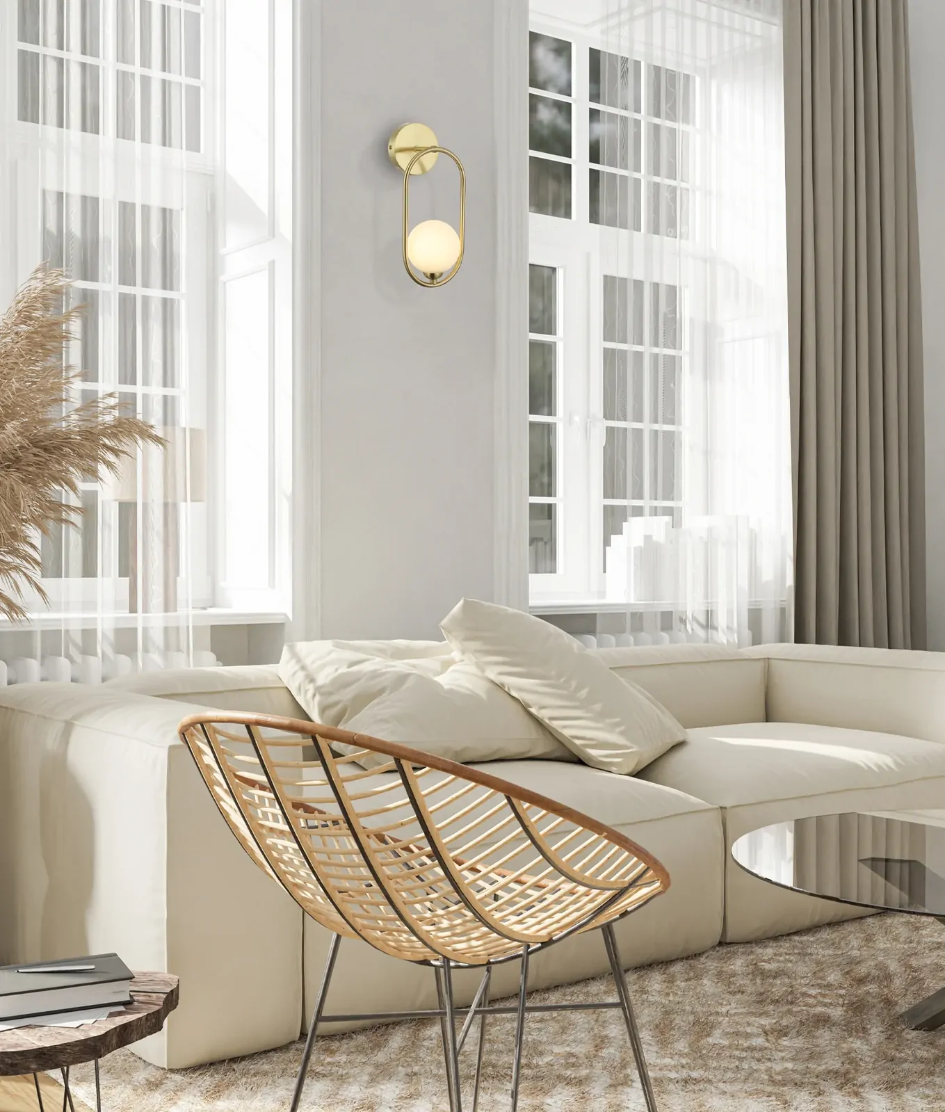 This round opal glass wall light features a refined satin gold frame that adds warmth and elegance to contemporary interior spaces. Designed to deliver soft, diffused illumination, it is ideal for bedrooms, hallways, living areas and bathroom vanity settings where gentle ambient lighting is desired.
