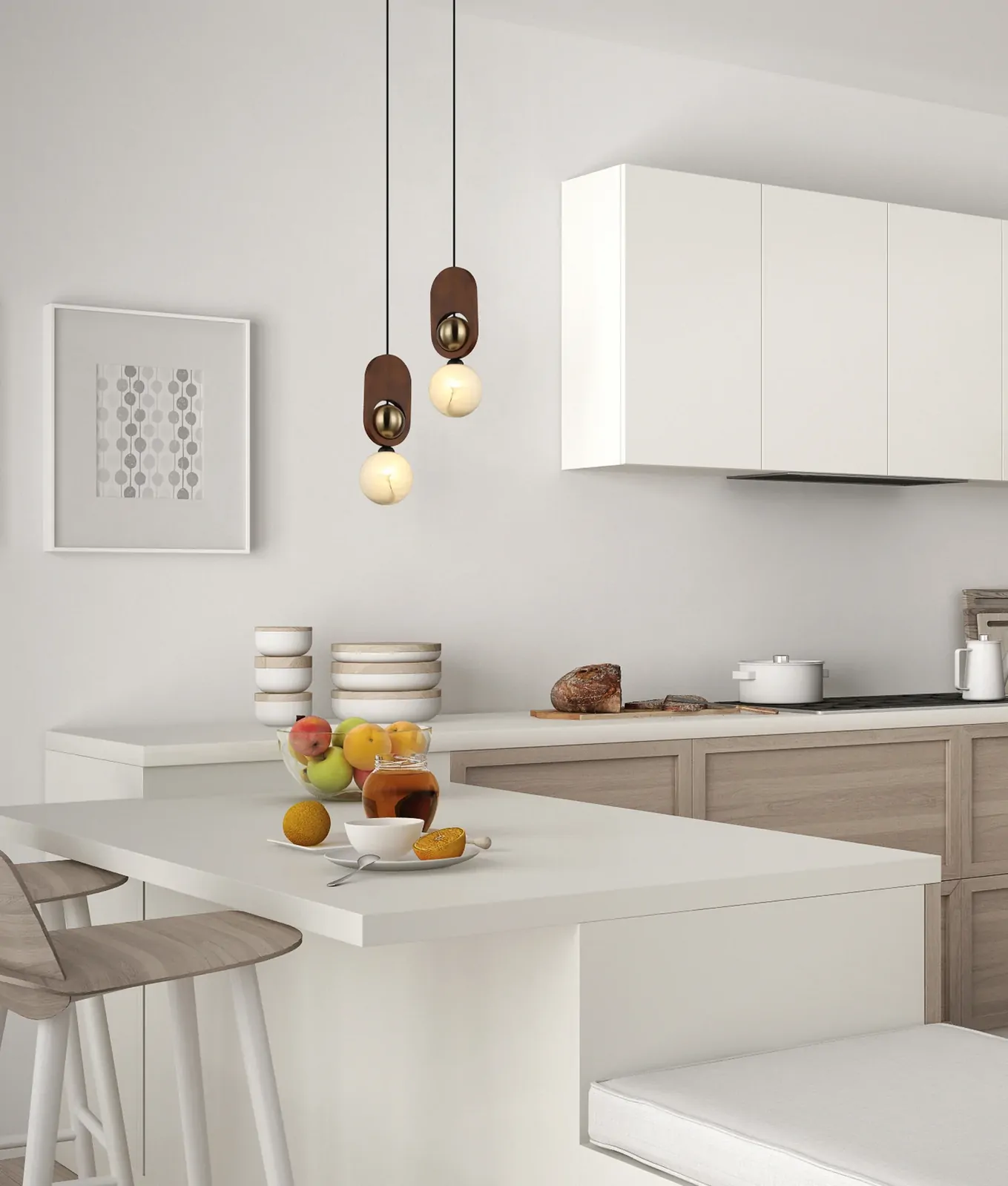 The sandblasted opal diffuser delivers even light distribution while maintaining a calm, inviting atmosphere. Brass hardware adds a subtle layer of sophistication, while the timber highlight introduces warmth and texture, allowing the pendant to complement modern, Scandinavian and mid-century inspired interiors.