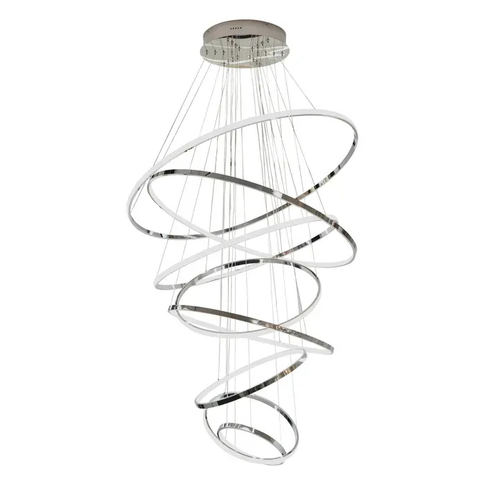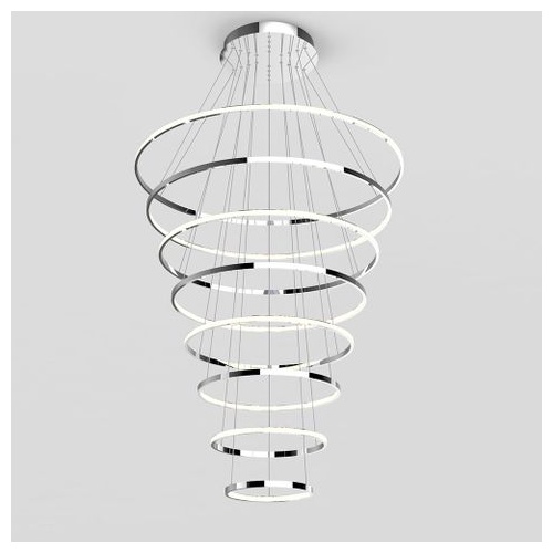 The Crown 8 Ring in chrome is an exceptional pendant light that offers a sophisticated and modern design. Featuring eight interlocking rings with a polished chrome finish, this fixture creates a dramatic visual impact while providing a bright 5000K cool white light. Ideal for large living rooms, dining areas, offices, or commercial spaces, it provides crisp illumination and a stylish touch to any environment.