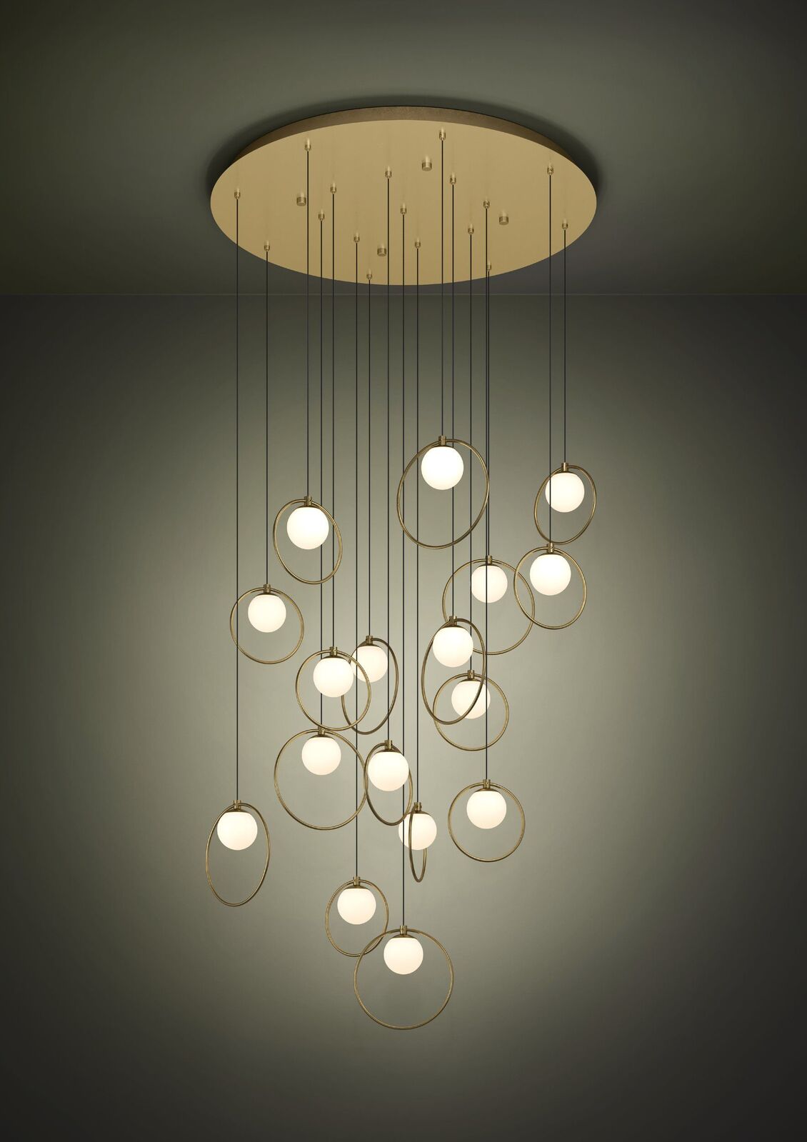 The PORTOCOLOM Integrated LED round pendant by Eglo makes a grand impression in a contemporary setting. The captivating silhouette has a magnetic personality with 17 shinny brass rings surrounding white sphere glass shades. Hung from a round gold canopy with black adjustable hanging cords.