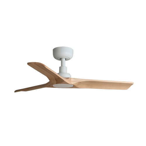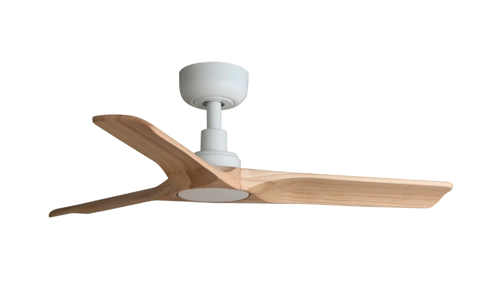 The Heywood 90cm DC ceiling fan in white with pine timber blades is a premium designer ceiling fan for Australian homes that want quiet airflow, natural materials and a refined architectural finish in a compact size. With its sculpted matt white motor housing, three elegantly curved FSC-certified timber blades and clean European styling, this ceiling fan is ideal for bedrooms, studies and other small spaces under 13m² where both performance and aesthetics matter. Faro describes the Heywood as delivering strong airflow, silent performance and refined design, making it a strong option for customers searching for a compact white ceiling fan with timber blades. This no app control model includes a remote control with timer and uses an efficient DC motor with six speed settings and reverse mode for year-round comfort. It is suitable for flat or angled ceilings up to 12 degrees and is compatible with optional 26mm downrods for higher ceilings. This shortened-link page is the fan-only version, not the integrated light model, and Faro states that an optional dimmable LED light kit is available separately with warm, neutral and cool colour temperature options.