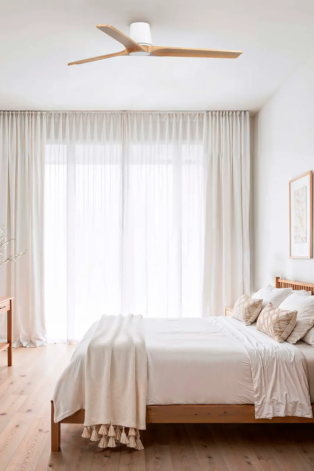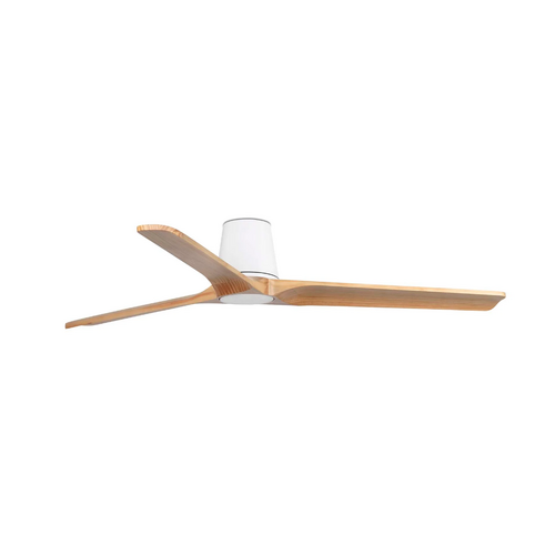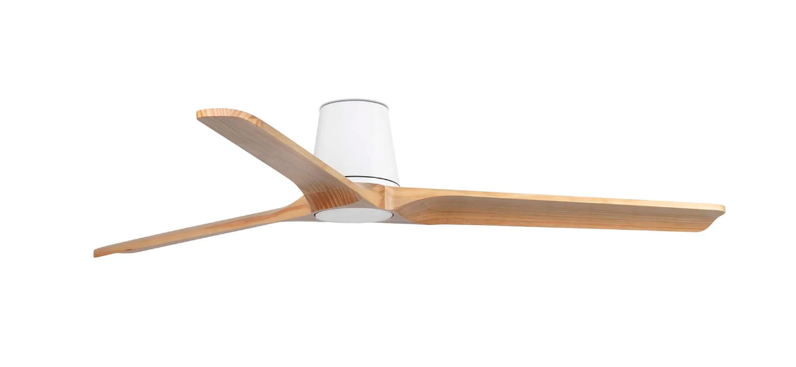 The Heywood Tub 132cm DC ceiling fan in white with pine timber blades is a premium low profile ceiling fan designed for Australian homes that want quiet airflow, natural materials and a refined modern finish. With its compact tub-style motor housing, curved FSC-certified pine timber blades and matt white aluminium structure, this fan is ideal for bedrooms, living spaces, studies and other rooms where low ceiling clearance and designer styling matter. Faro describes the Heywood Tub as a compact timber-style fan with strong airflow, silent performance and a clean considered look. This no app control model includes a remote control with timer and uses an efficient DC motor with six speed settings and reverse mode for year-round comfort. The product page says this shortened-link version is the fan-only model, with an optional dimmable LED light kit sold separately, and it is designed for flat low ceilings with a total height of 19cm, making it suitable for ceilings as low as 2.3m. Faro also states that Tub models are not suitable for sloped ceilings and are not compatible with downrods.
