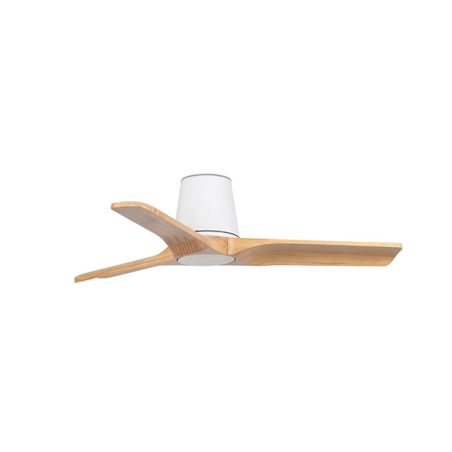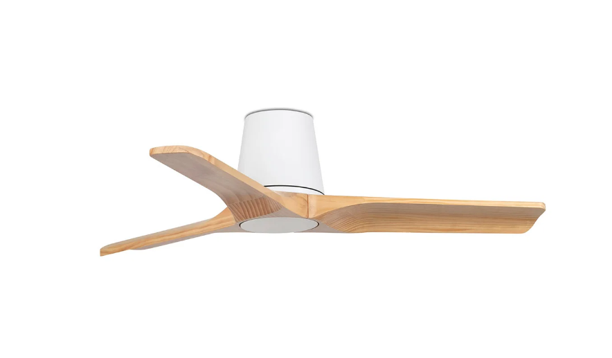 The Heywood Tub 90cm DC ceiling fan in white with pine timber blades is a premium low profile ceiling fan for Australian homes that want quiet airflow, natural materials and a refined modern finish in a compact size. With its matt white aluminium body, three elegantly curved FSC-certified pine timber blades and streamlined tub-style profile, this designer ceiling fan is ideal for bedrooms, studies and other small spaces under 13m² where low ceiling clearance and visual warmth both matter. Faro describes the Heywood Tub as offering strong airflow, silent performance and refined design in a compact form. This no app control model includes a remote control with timer and uses an efficient DC motor with six speed settings and reverse mode for year-round comfort. The flush-mount tub design sits just 19cm from the ceiling, making it suitable for ceilings as low as 2.3m. This shortened-link page is the fan-only version, not the integrated light model, and Thermosoft states that an optional dimmable LED light kit is available separately, with warm, neutral and cool colour temperature options. It is also not suitable for sloped ceilings and is not compatible with downrods.