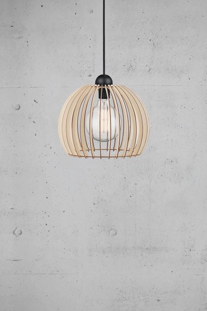 Pendant light in a graphic design, with a shade composed of wooden slats providing pleasant light distribution. When the light bulb is visible between the slats, it is recommended to supply the light with a decorative bulb. The light is ideal over the kitchen or dining table the light bulb is not included.