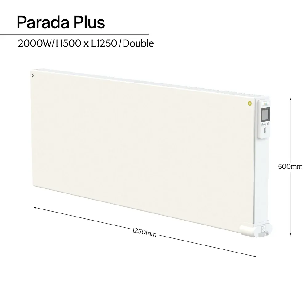 The Parada Plus 2000W electric oil filled radiator in 500mm x 1250mm is a high output double panel electric heater designed for Australian homes that need premium radiant and convection warmth in larger spaces. With its modern flat-front steel design, advanced thermostat controls and efficient oil-filled construction, this UK-made radiator is ideal for open-plan living spaces, larger bedrooms and premium residential heating installations.