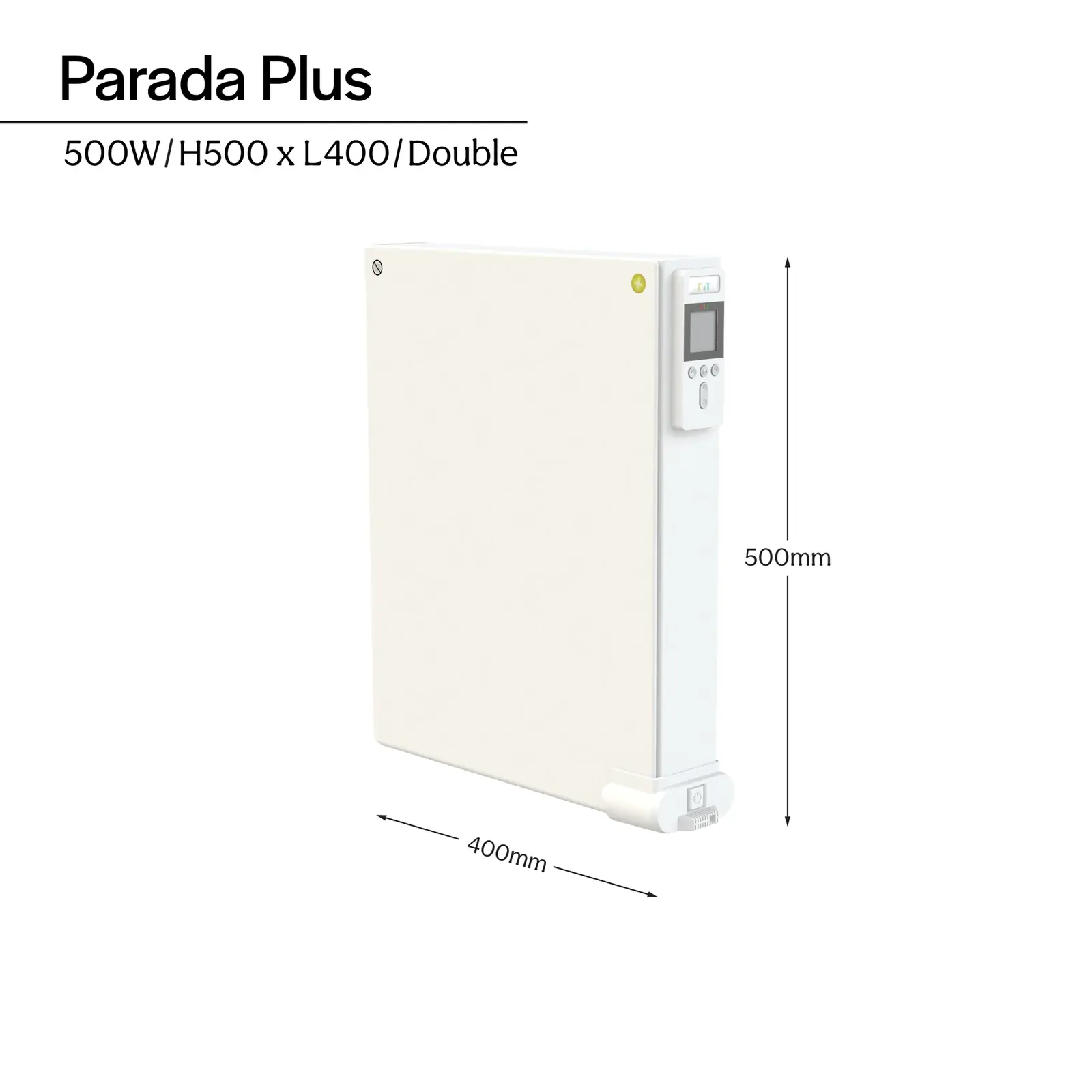 The Parada Plus 500W electric oil filled radiator in 500mm x 400mm is a compact upright double panel wall heater designed for Australian homes where wall width is limited. With its taller format, flat steel front and intelligent thermostat features, this UK-made electric radiator offers premium radiant and convection heat in a neat modern package ideal for bedrooms, hallways and smaller living zones.