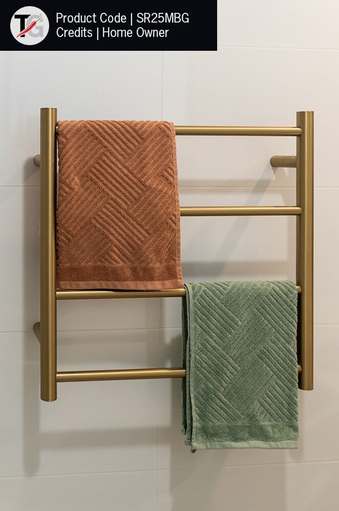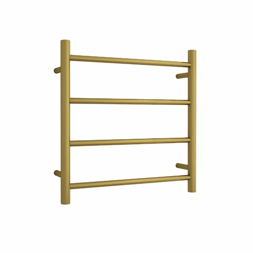 Heated Towel Rails are an affordable luxury for every bathroom for warming and drying your towels. The SR25MBG Heated Towel Rail is a 550x550mm 4 bar brushed gold ladder rail which features multiflex wiring. This smaller size rail is ideal for when only a small space is available in the room and for drying one towel. The brushed gold finish is of the highest quality to ensure it matches with most brushed gold tapware.