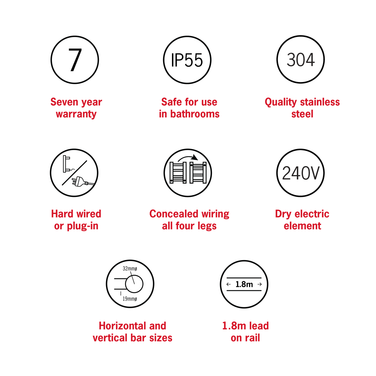 Designed for safe bathroom installation, the rail uses an efficient dry electric heating element that evenly distributes heat across the bars. With ten horizontal bars and a generous 700mm width, it provides plenty of space for warming multiple towels while maintaining a slim profile against the wall.