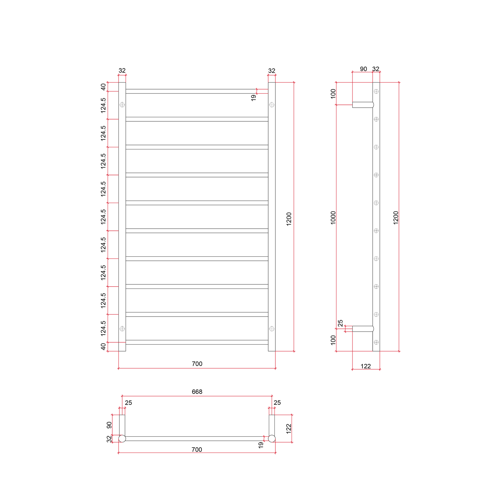 With a generous 700mm width and 1200mm height, the rail features ten horizontal bars to accommodate multiple towels. Thermorail’s multiflex wiring system allows installation as either plug-in or hardwired, with power connection available from any of the four mounting legs for flexible installation during bathroom renovations or new builds.