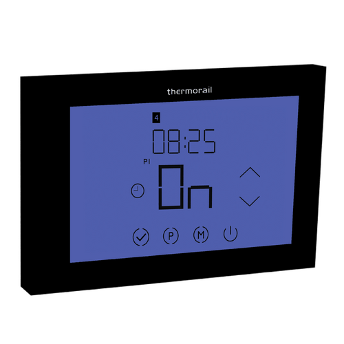 The TRTSLB Thermorail Timer is a black landscape digital touch screen timer ideal for controlling Thermorail Heated Towel Rails. The timer allows you to set a schedule for exactly when your heated towel rail is operating and how long it is on for.