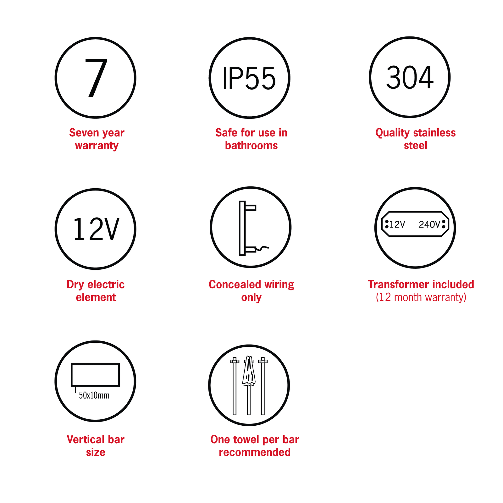 The Thermorail single bar heated towel rails are all 12Volt which means they are safe to be installed anywhere in the bathroom, even close to water. All the 12Volt single bar rails are provided with a transformer in the box. We also recommend the use of a timer to control the rails and save on running costs.