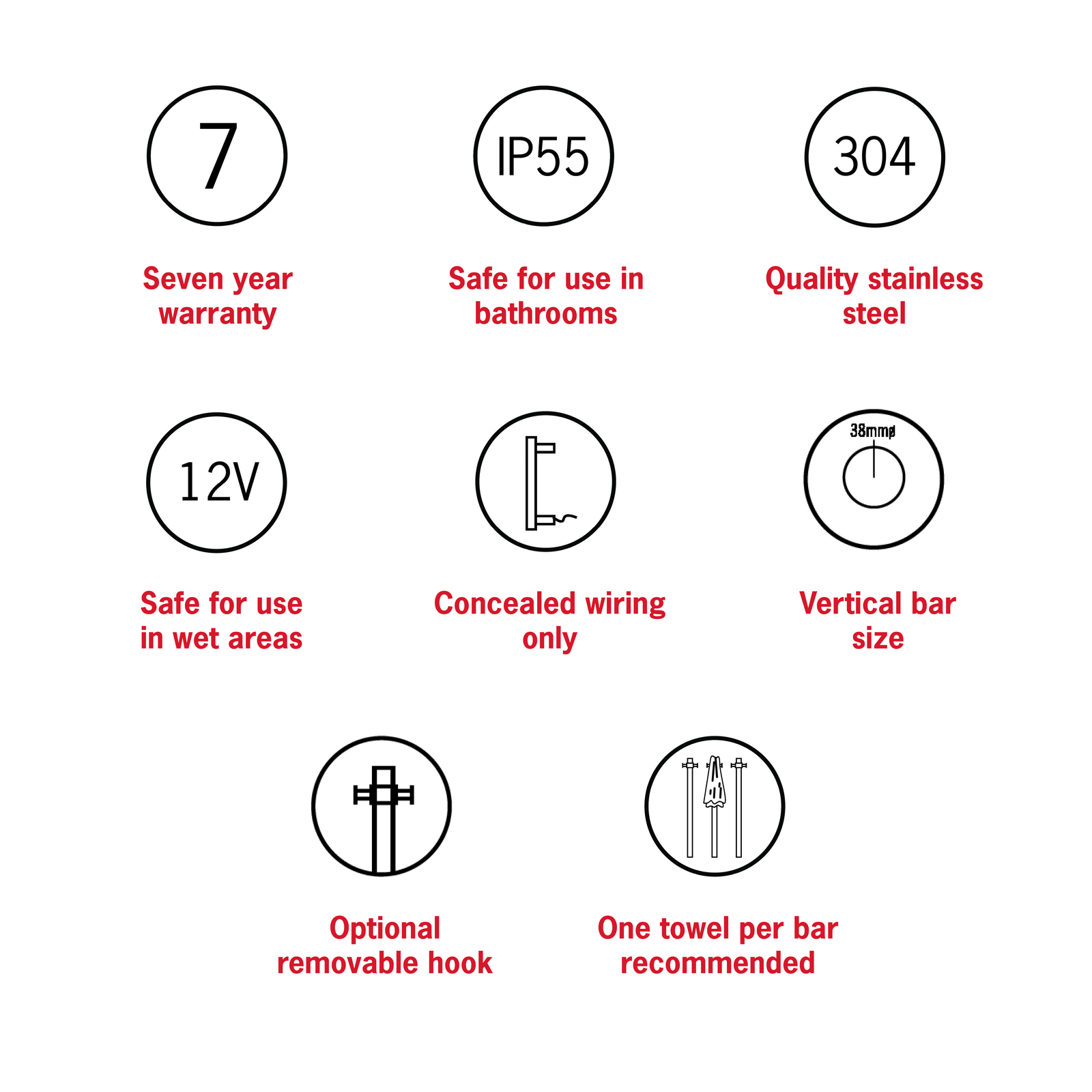 All Thermorail vertical heated towel rails include an optional towel hook which can be fitted on the rail at the time of install. This hook allows for the towel to be more easily hung over the vertical rail. Whilst the vertical rail will assist in drying your towel, it does have less surface contact then a ladder rail and therefore will be less effective in drying and warming your towel than a ladder.
