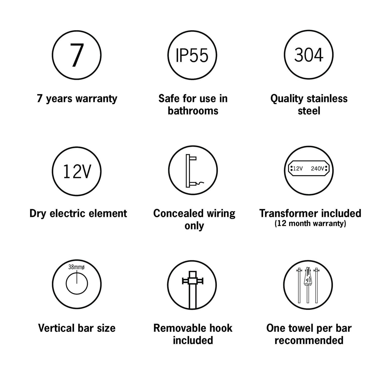 The Thermorail single bar heated towel rails are all 12 volt which means they are safe to be installed anywhere in the bathroom, even close to water. All the 12 volt single bar rails are provided with a transformer in the box.