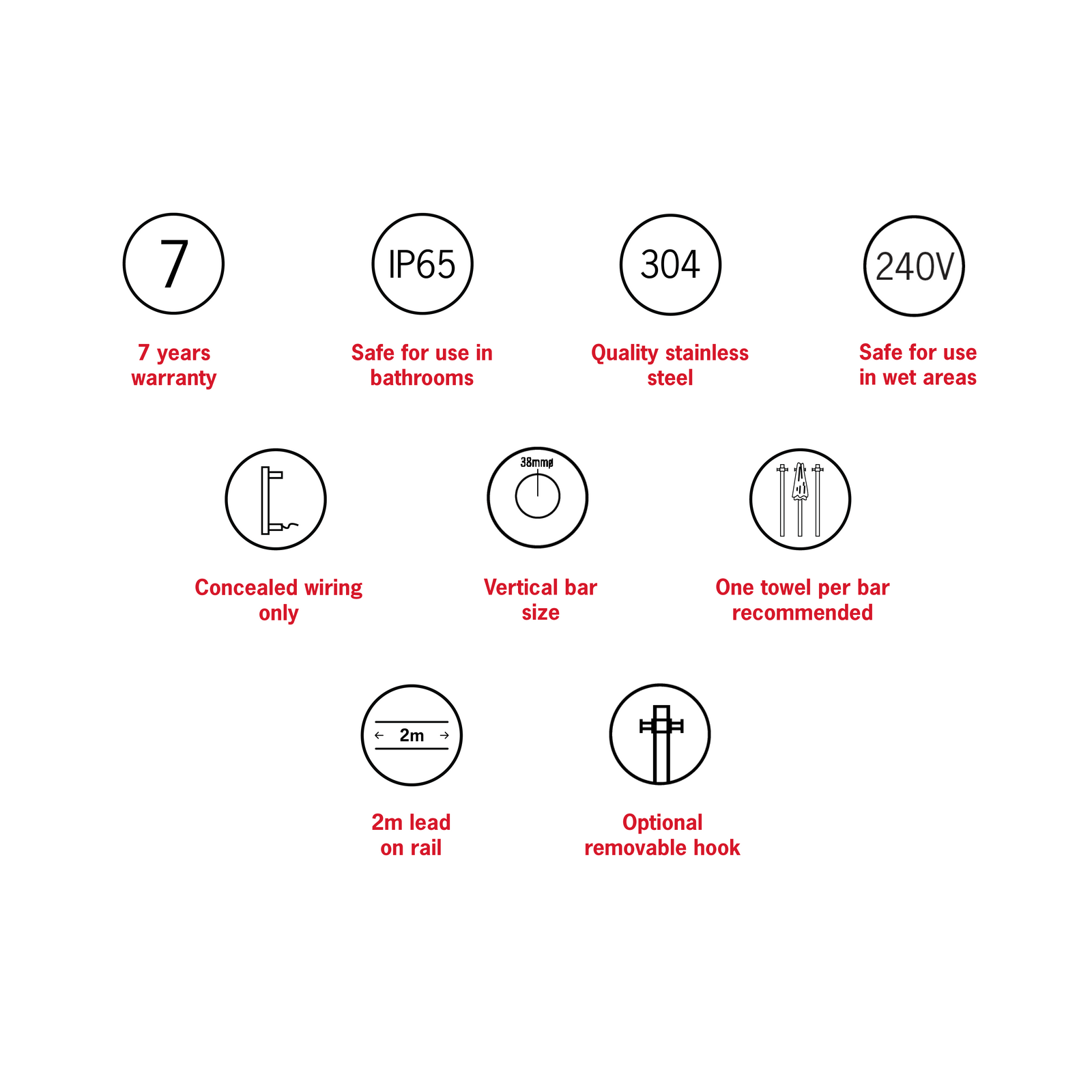 All Thermorail vertical heated towel rails include an optional towel hook which can be fitted on the rail at the time of install. This hook allows for the towel to be more easily hung over the vertical rail. Whilst the vertical rail will assist in drying your towel, it does have less surface contact then a ladder rail and therefore will be less effective in drying and warming your towel than a ladder.