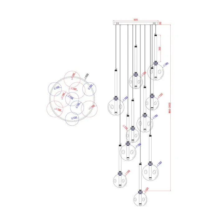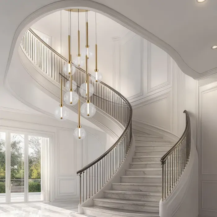 The round ceiling plate allows for a balanced cluster arrangement, making it perfect for stairwells, voids, and entryways where vertical impact is essential. With its blend of warm brass and crystal-clear glass, this pendant strikes the perfect balance between modern design and timeless sophistication.