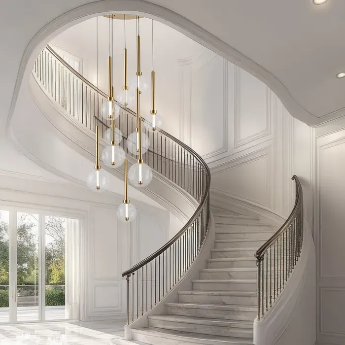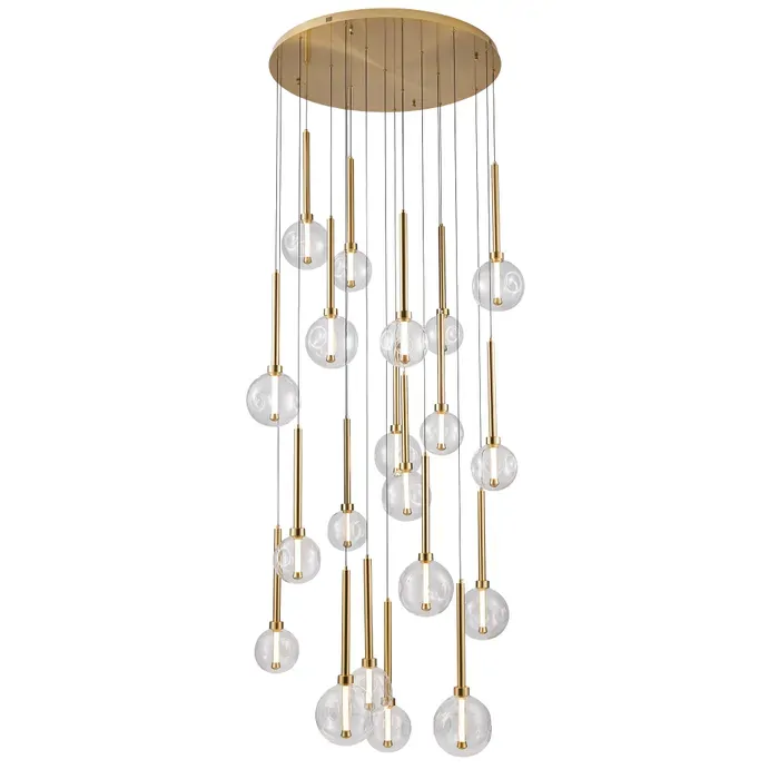 The wide round ceiling plate supports an elegant waterfall of lights, perfect for creating drama in stairwells, double-height entryways, or voids. The combination of warm brass detailing and clear glass globes adds both modern sophistication and timeless glamour.