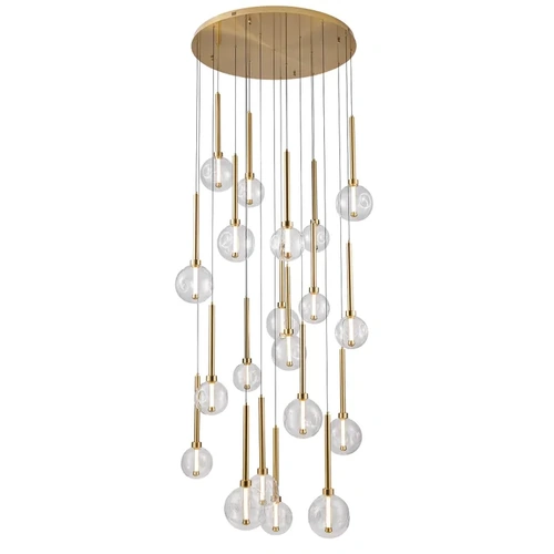 The Brass and Glass 20-Light Round Cluster Pendant is a breathtaking statement piece designed for grand spaces. Featuring eighteen glass globes suspended at varying heights from slender brass rods, it delivers a luxurious cascading effect that draws the eye and transforms any interior.