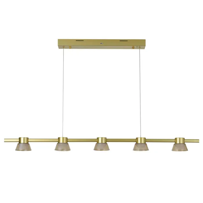Modern elegance meets timeless style. The Linear 5-Light Brass Pendant combines a sleek brushed brass frame with five evenly spaced lights, each finished with a clear glass shade for a warm, refined glow.